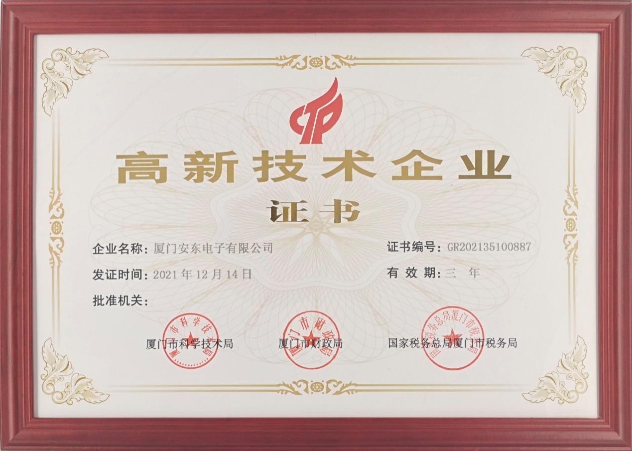 廈門安東電子連續(xù)16年榮獲廈門市高新技術企業(yè)稱號