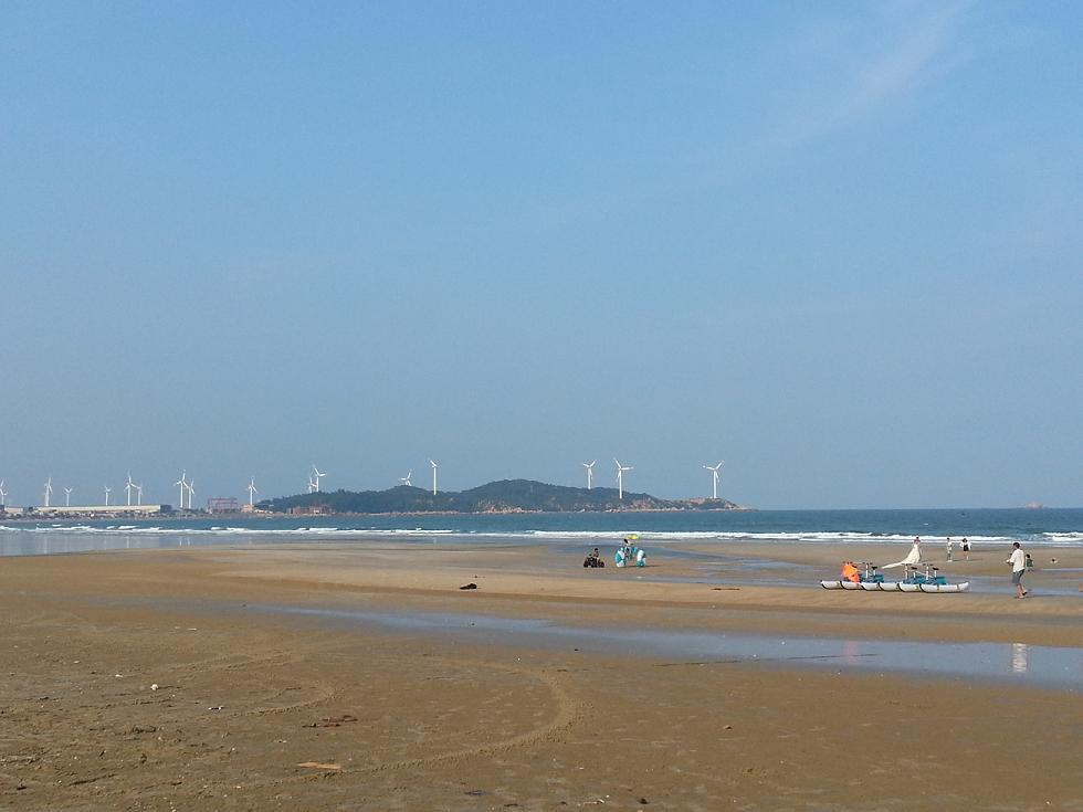 我望著成排的風(fēng)車,心里也感到無比的放松和喜悅。深呼氣,含有大海淡淡的空氣撲鼻而來,映入眼簾的是一片寬廣的沙灘,一些娛樂設(shè)備整齊地擺放在沙灘上,這是個還沒有完全開發(fā)的景點,所以我們感受不到類似其他景點的濃厚的商業(yè)氣息,沒有嘈雜的聲音,沒有黑壓壓的人群,從眼前拂過的僅僅是彌漫著淡淡海水味的空氣,還有就是讓我們內(nèi)心得到放松的寧靜。踩著細膩的沙子伴著一絲的波紋,心仿佛開始隨著波浪的涌動跳動著,心里再多不能解開的思緒頓時化作烏有。在這里,我們?nèi)粘I钪芯o張疲憊的心情得以舒緩,放開身心去親近自然,就能感受自然界神奇的創(chuàng)造力和頑強的生命力,那我們還有什么事放不下的呢?