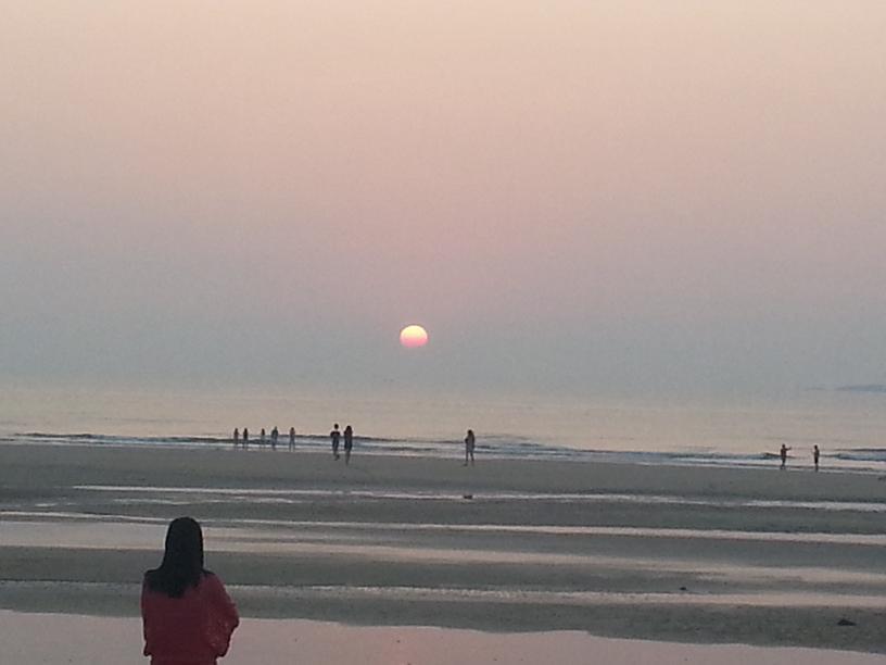 觀看海上日出,這是我期待已久的事情。時間一分一秒的向前挪移著,安靜的六鰲開始熱鬧起來了。凌晨六時,在大家的驚呼聲中,太陽終于揭開了她神秘的面紗。微弱的紅光,越來越大,越來越大,不到一分鐘,太陽就全部出來了。只是此時的太陽,還是比較溫和的,在跟我們展示她的友好,我覺得真不是一個“美”字能夠概括的。